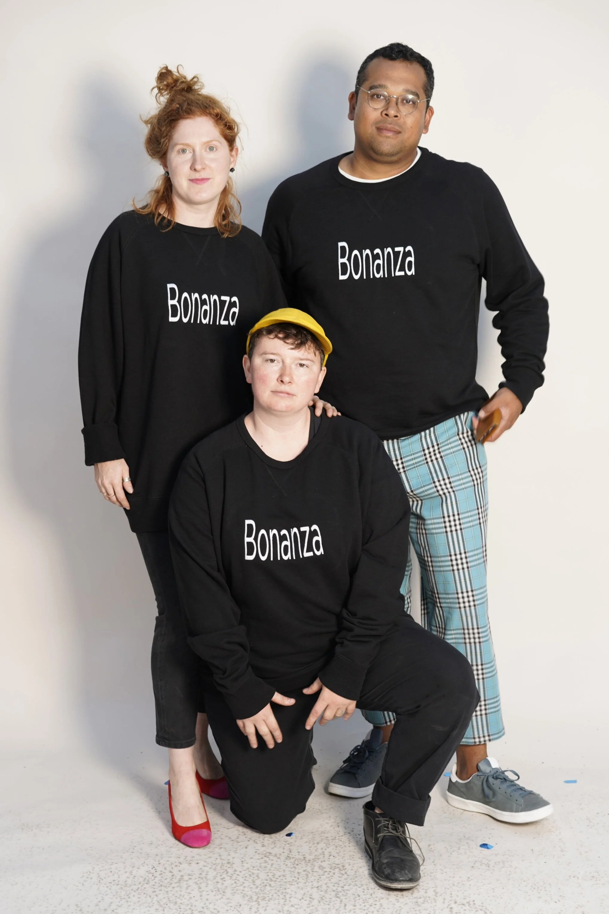 Bonanza is the collaborative practice of Conrad Guevara, Lindsay Tully, and Lana Williams. The singular name, Bonanza, acts as the persona for which we perform under and it is with this moniker that we challenge the notion of the singular, heroic artist. Bonanza’s diverse projects include installation, film, fashion and performance. Our work strategically challenges the fixity of identity through different forms of signaling, posturing, flexibility, and resilience.